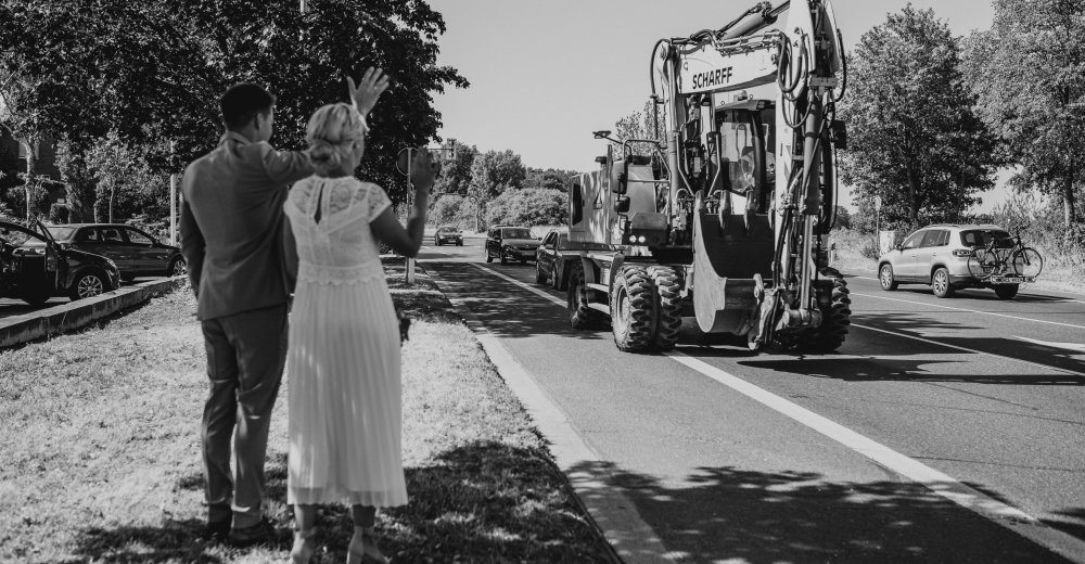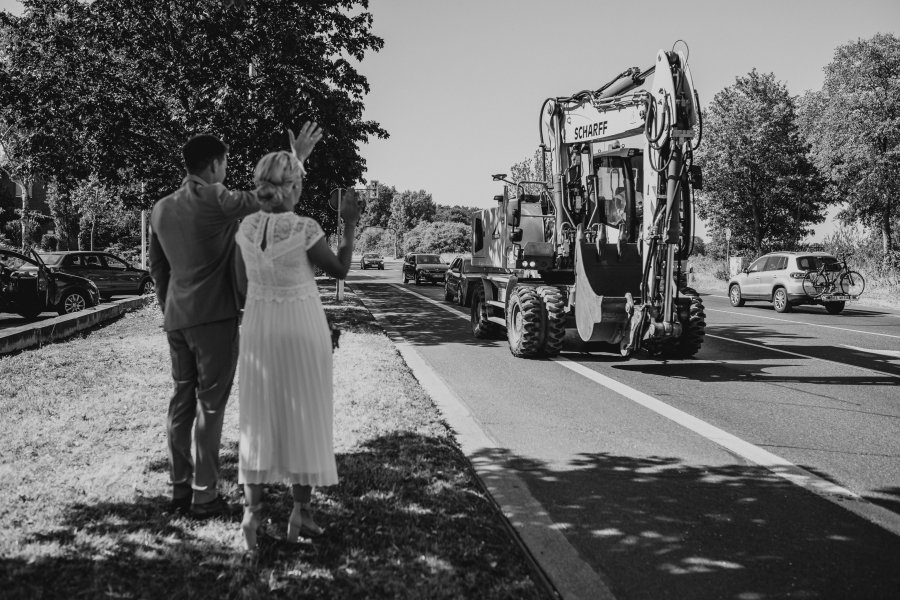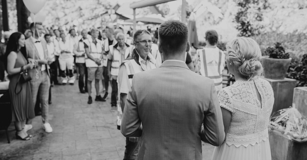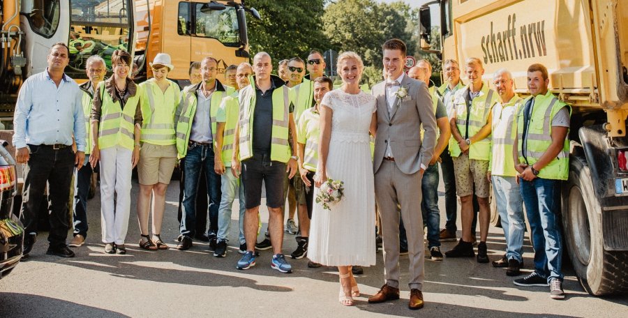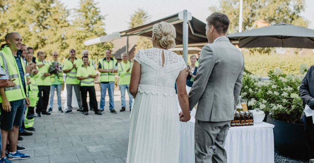 Mit einem überwältigenden Empfang gratuliert das SCHARFF-Team dem frisch vermählten Brautpaar Isabelle und Jan Brand.