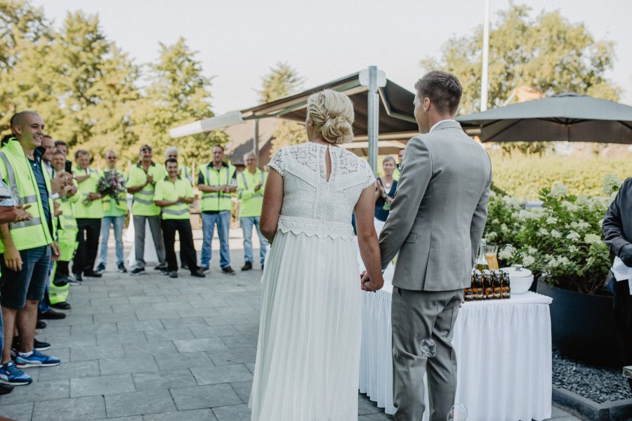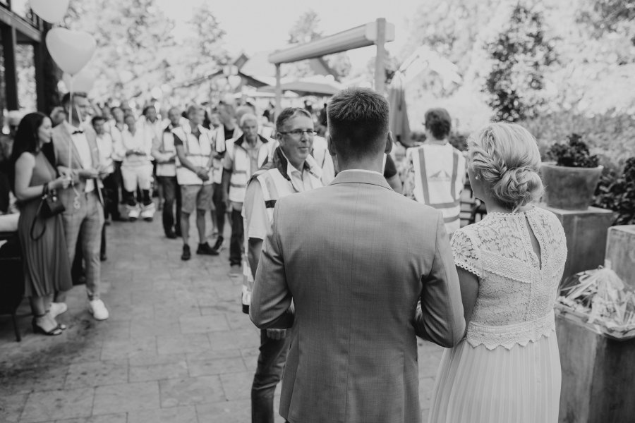 Mit einem überwältigenden Empfang gratuliert das SCHARFF-Team dem frisch vermählten Brautpaar Isabelle und Jan Brand.