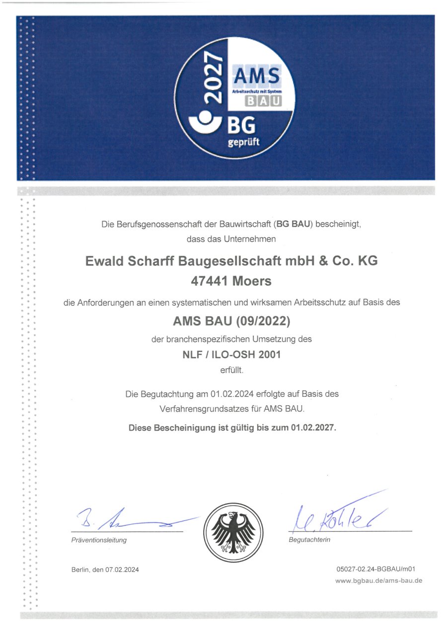 Wer heute als Unternehmen der Bauwirtschaft im Wettbewerb bestehen möchte, benötigt ein effektives Arbeitsschutzmanagementsystem (AMS). Mit dem praxisorientierten Konzept „AMS BAU“ der Berufsgenossenschaft der Bauwirtschaft (BG BAU) haben wir unseren betrieblichen Arbeitsschutz effektiv organisiert – und können nun als eines von mittlerweile rund 1.000 begutachteten Unternehmen die dazugehörige Bescheinigung vorweisen. Damit setzen wir ein klares Zeichen für die Sicherheit und Gesundheit unserer Mitarbeiterinnen und Mitarbeiter.